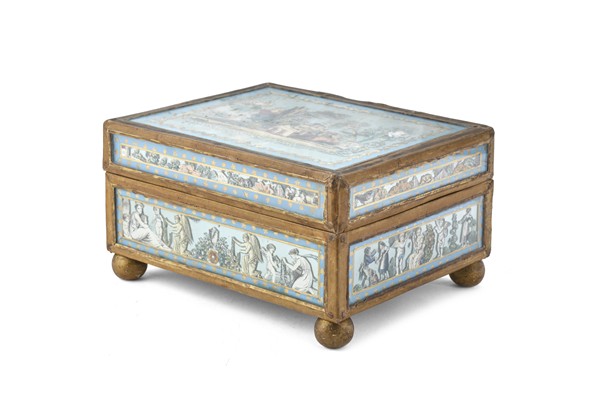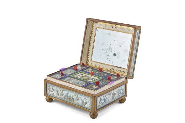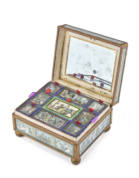 19th-century French jewelry box with paper miniatures applied under glass; interior with mirror and nine compartments, including a hidden one revealed by a secret mechanism; mounted on ball feet (19×10×16 cm) (defects).