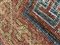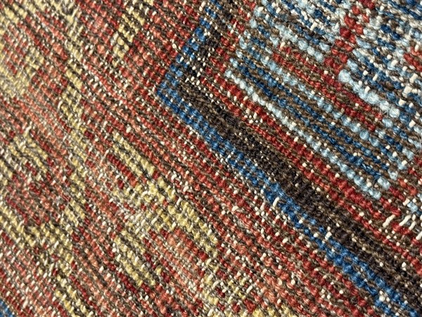 Tappeto Kashgar, Turkestan orientale, secolo XIX. Decoro a griglia azzurra e bianca su fondo rosso. Bordura principale a meandro su fondo bianco. Bordura esterna con rami fioriti stilizzati su fondo rosa (cm 375x206) (difetti e rapature)
