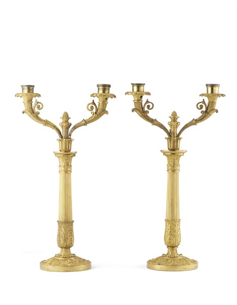 Coppia di candelabri a due luci in bronzo dorato, fusto a colonna scanalata, ba