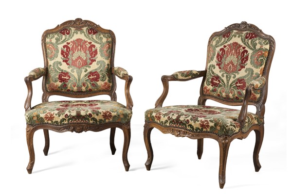 Coppia di poltrone in noce intagliato con fascia e schienale sormontato da foglie e fiori, braccioli mossi terminanti a ricciolo. Secolo XVIII. Rivestimento in tessuto operato (difetti)