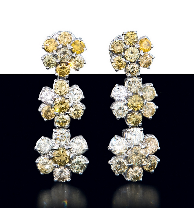 COPPIA DI ORECCHINI PENDENTI. In oro bianco 18 kt perno e farfalla realizzati a tre fiori verticali incernierati disposti in gradazione dal basso impreziositi da diamanti taglio brillante incolore e fancy con diverse sfumature di colore per tot. cts. 8,70 ca. disposti anche al retro.
