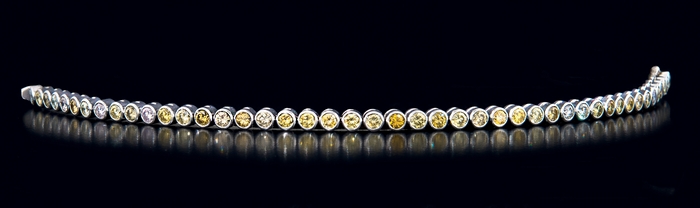 BRACCIALE TENNIS. In oro bianco 18 kt interamente percorso da diamanti taglio brillante incolore e fancy con diverse sfumature di colore per tot. cts. 5,30 ca. entro castoni tondi a cipollina.
