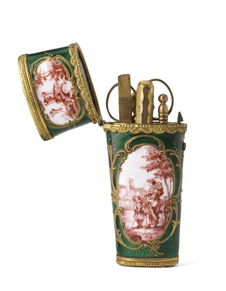 Arte francese, fine secolo XVIII. Etui in bronzo e smalti verdi a grisaille raf