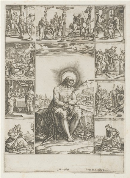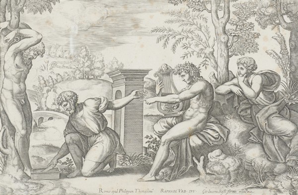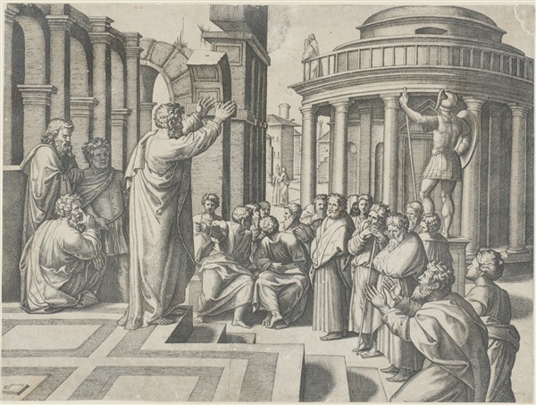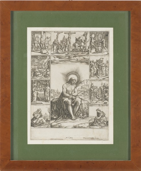 Lot consisting of a pair of engravings by Giulio Bonasone from the series "Amori Sdegni et Gielosie di Giunone" depicting "A Woman in Labour Calls on Lucina" and "The Triumph of Juno" (unidentified collector's stamp at lower right) (impression mm 135x105 each), an engraving by Marcantonio Raimondi after Raphael depicting "Saint Paul Preaching in the Areopagus of Athens" (sheet mm 259x347), an engraving by Giorgio Ghisi depicting "The Man of Sorrows" (original sheet mm 314x226) and an engraving by Master "B nel Dado" after Raphael (sheet mm 187x285)