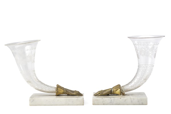 Two engraved glass cornucopias with stylized motifs ending in gilded metal hands on marble bases. 19th century (L max 22 cm) (defects and restorations)