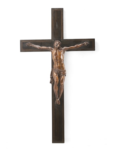 Crocifisso in legno di bosso intagliato, su croce in legno ebanizzato e filettato in ottone d'epoca successiva (cm Cristo 28x27, h. tot cm 59) (difetti e restauri)