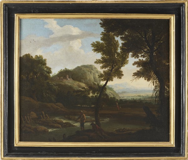 "Paesaggio fluviale con pescatore e figure"