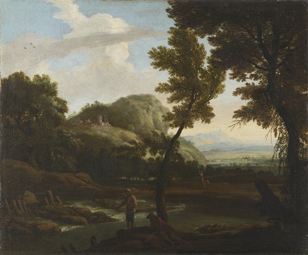 "River landscape with fisherman and figures"