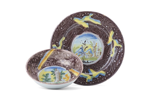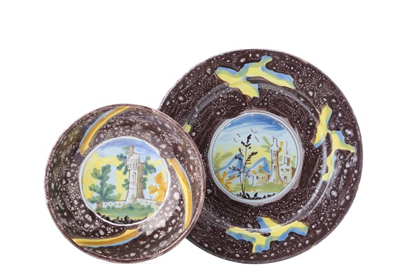 Manifattura di Pavia, secolo XVIII. Lotto composto da una ciotola e un piatto in maiolica dipinta in policromia nel cavetto con paesaggio e castelletto entro riserva su fondo spugnato manganese (d cm 16,5 e 23) (difetti)