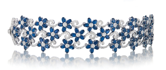 BRACCIALE. In oro bianco 18 kt realizzato a tre file di motivi a fiore alternati da settori a voluta impreziositi da diamanti taglio brillante per tot. cts. 2,10 ca. e zaffiri taglio ovale per tot. cts. 38,40 ca.