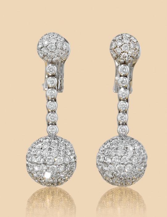 COPPIA DI ORECCHINI PENDENTI FIRMATI DE GRISOGONO. In oro bianco 18 kt perno ripieghevole e clip con settori verticali incernierati e motivi a sfera e semisfera alle estremità, diamanti taglio brillante per tot. cts. 6,00 ca. (prob. colore G purezza VS/VVS), entro astuccio originale.