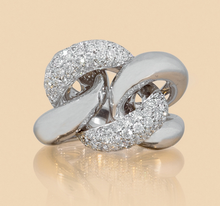 ANELLO. In oro bianco 18 kt, sommità realizzata a maglia groumette con decoro in diamanti taglio brillante per tot. cts. 1,80 ca.