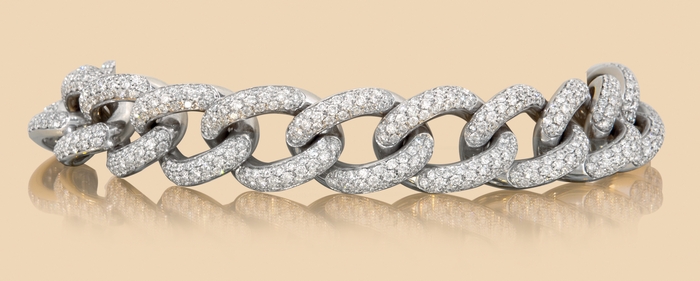 BRACCIALE. In oro bianco 18 kt interamente realizzato a maglie groumette con settori in diamanti taglio brillante disposti a pavè per tot. cts. 14,50 ca.