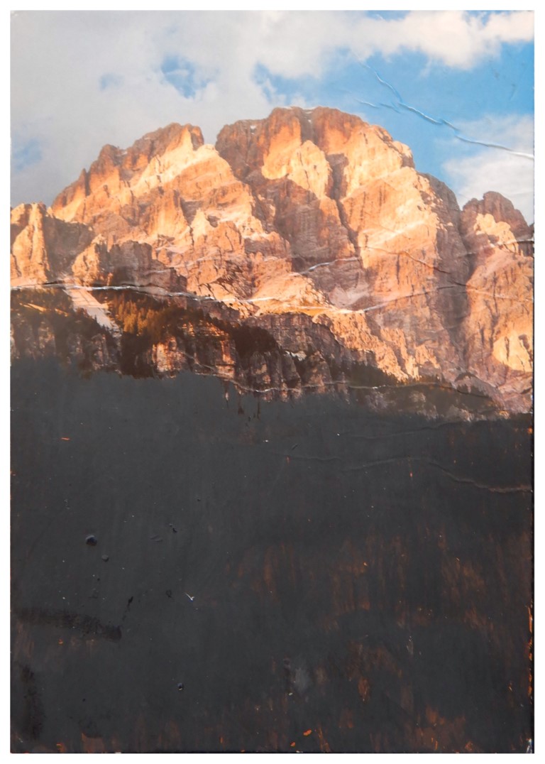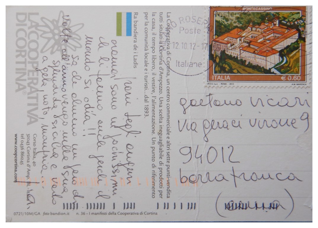 cartolina affrancata con pittura nera sul fronte e dedica sul retro, firma g.a. in basso a destra