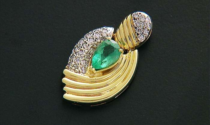 CIONDOLO. In oro giallo e bianco 18 kt a losanga centrato da smeraldo taglio goccia di cts. 2,20 ca. entro motivi costolati, diamanti taglio brillante per tot. cts. 0,40 ca.