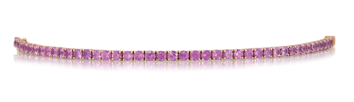 BRACCIALE TENNIS. In oro rosa 18 kt interamente percorso da zaffiri rosa taglio rotondo per tot. cts. 12,83 entro castoni a quattro griffes, allegato certificato n. 366008 Centro Analisi Gemmologiche, Dott. Pio Visconti, Valenza.