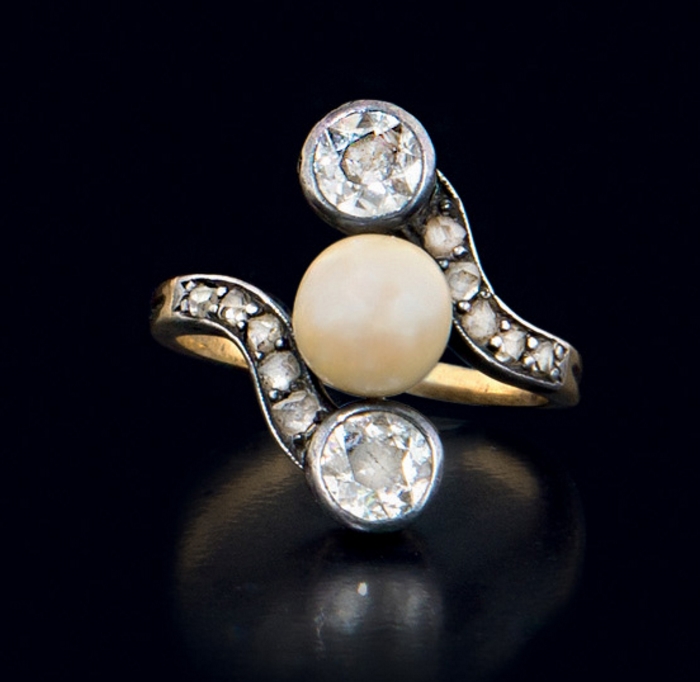ANELLO INIZIO XX SECOLO. In oro giallo ed argento con al centro perla (prob. naturale) di mm 8 ca. ai lati due diamanti taglio vecchio per tot. cts. 1,40 ca., diamanti taglio rosa a decoro della montatura.