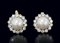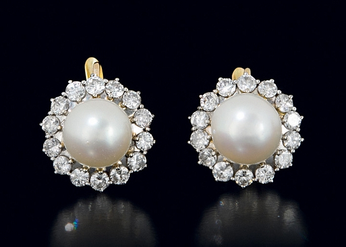 COPPIA DI ORECCHINI. In oro giallo e bianco 18 kt perno e clip, al centro perle coltivate South Sea di mm 9 ca. entro cornici in diamanti taglio brillante per tot. cts. 1,90 ca.