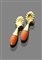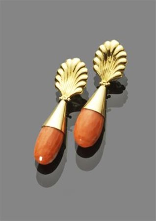 COPPIA DI ORECCHINI Coppia orecchini a clips in oro giallo con pendenti gocce di corallo Peso gr 15,40 yellow gold clip earrings with coral pendan drops Weight 15.40 gr