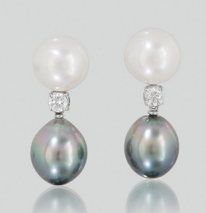 COPPIA DI ORECCHINI PENDENTI. In oro bianco 18 kt perno e farfalla, realizzati a doppio corpo con perle coltivate South Sea di mm 12 ca., settori in diamanti taglio brillante per tot. cts. 0,50 ca. e perle coltivate Tahiti piriformi di mm 12x14 ca. imperniate nella parte terminale.