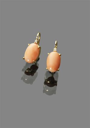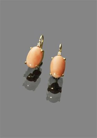 COPPIA DI ORECCHINI Coppia orecchini in oro giallo con due coralli rosa ovali e piccoli diamantini per complessivi ct 0,06 Peso gr 6,00 yellow gold earrings with oval pink coral and small diamonds apprx total 0,06 kt Weight 6.00 gr