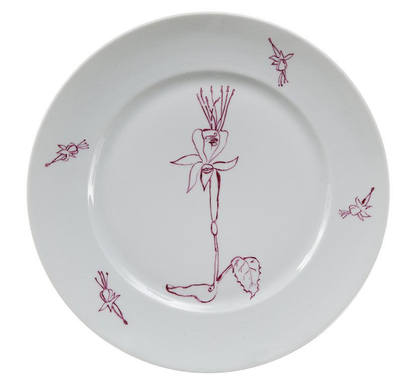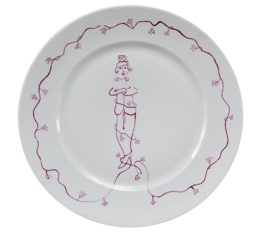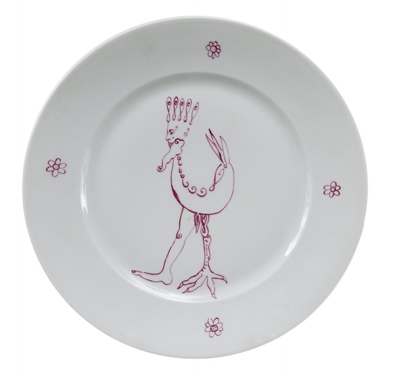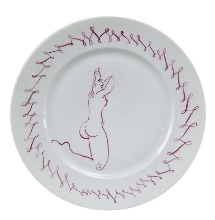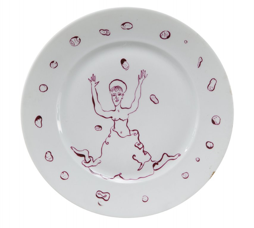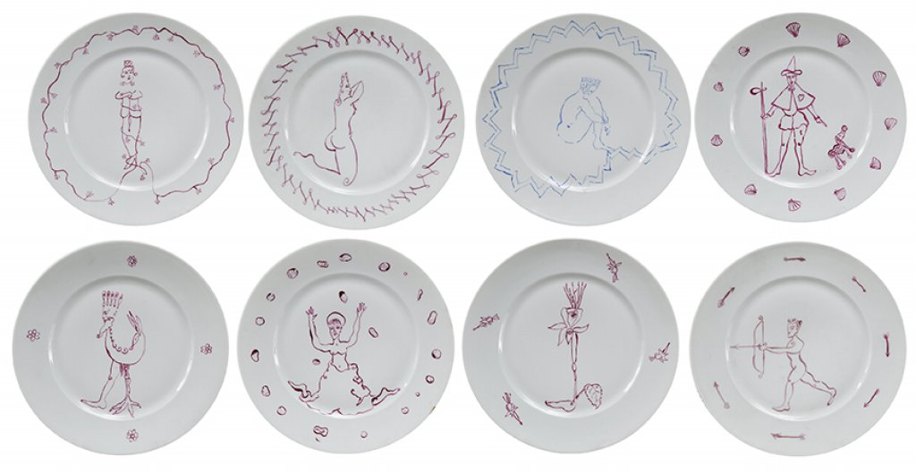 LUIGI ONTANI (1943-) Otto piatti 1985smalto su porcellana biscotta diam cm 26...