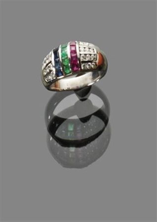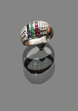 ANELLO Anello a fascia in oro bianco con pavé di piccoli rubini, zaffiri, smeraldi taglio carré a lato diamanti taglio brillante per complessivi ct 0,35 ca Peso gr 7,00 white gold band ring with pavé of small rubies, sapphires, emeralds and asccher cut side diamonds totaling about 0.35 kt Weight 7.00 gr