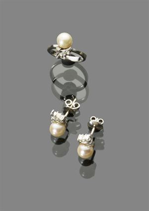 PARURE Parure in oro bianco titolo 14 kt . Composta da anello con perla e quattro diamantini . Coppia di orecchini con perle e diamantini. Peso gr 8,30 Ensamble composed of: one 14 kt gold ring with pearl and 4 small diamonds one pair of 14 kt gold pearl and diamond earrings Weight 8.30 gr