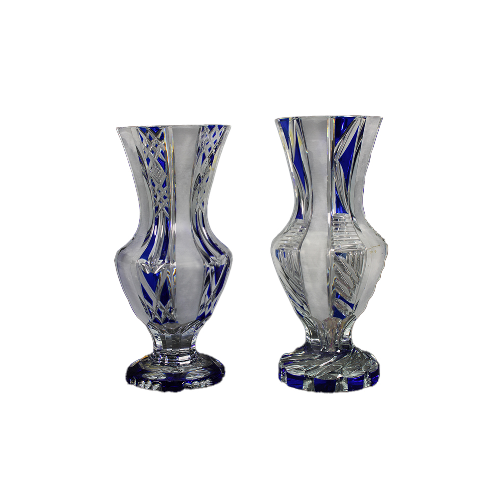 DUE VASI in cristallo intagliato con rivestimento in blu maestranze italiane XX secolo h cm 26 x 12