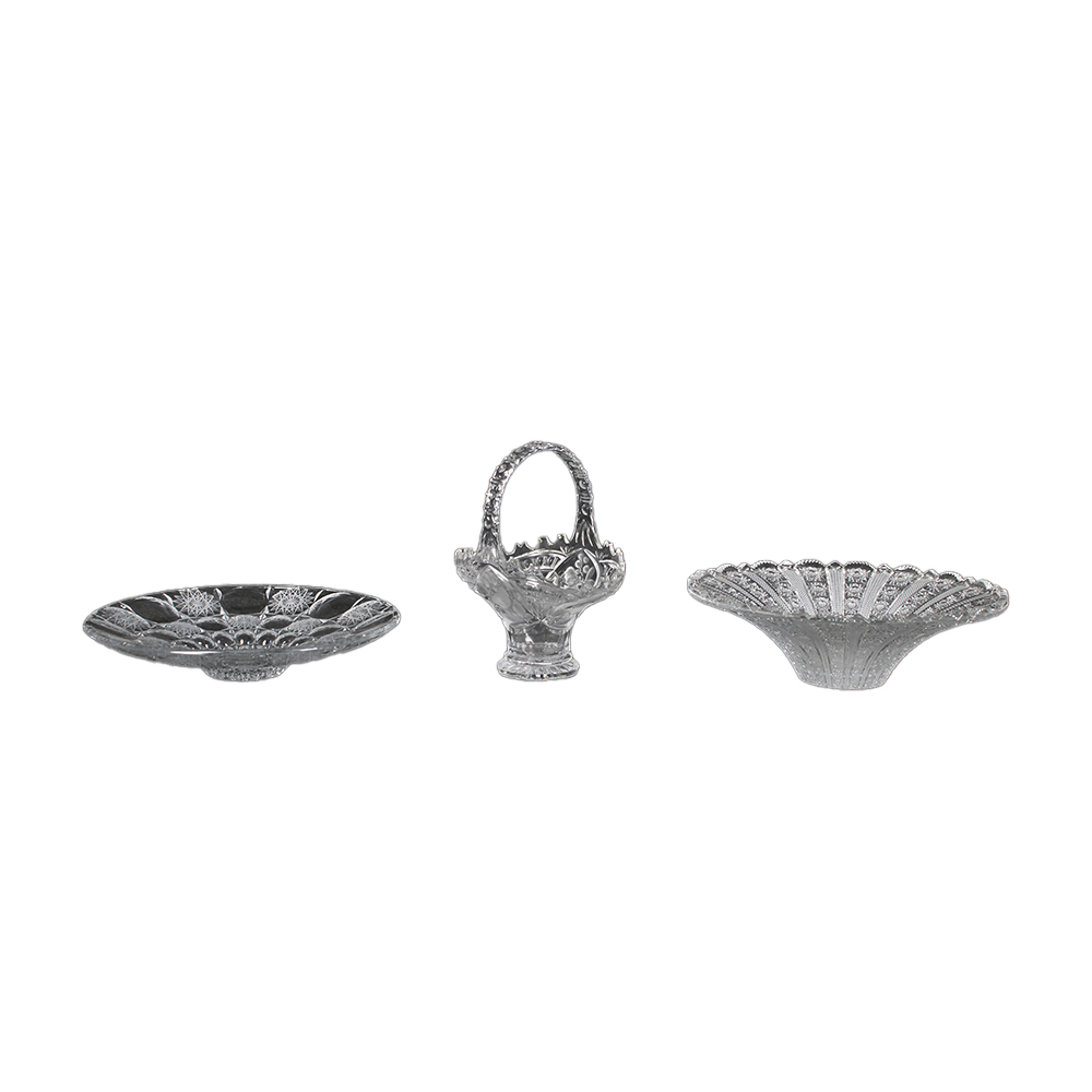 LOTTO COMPOSTO DA due centrotavola ed un alzata a forma di cesto in vetro intagliato manifattura francese XX secolo misure varie