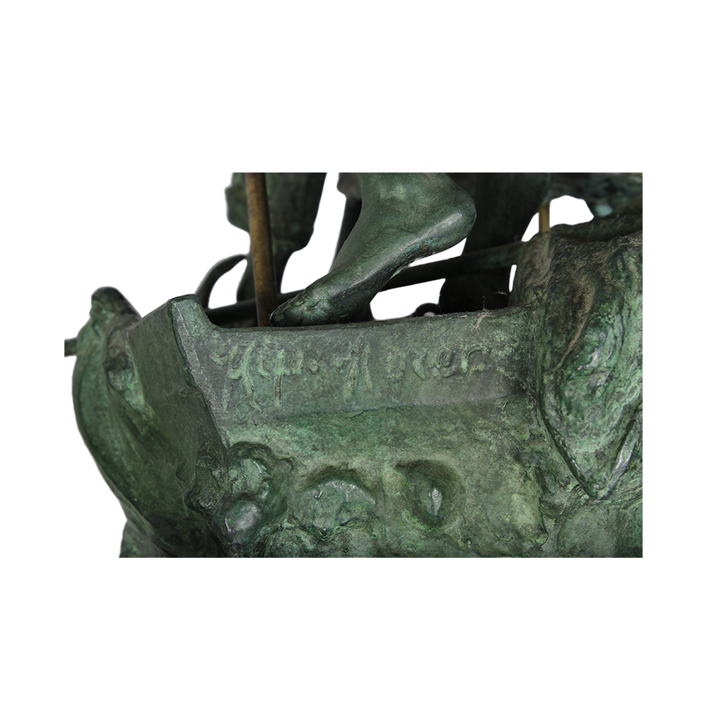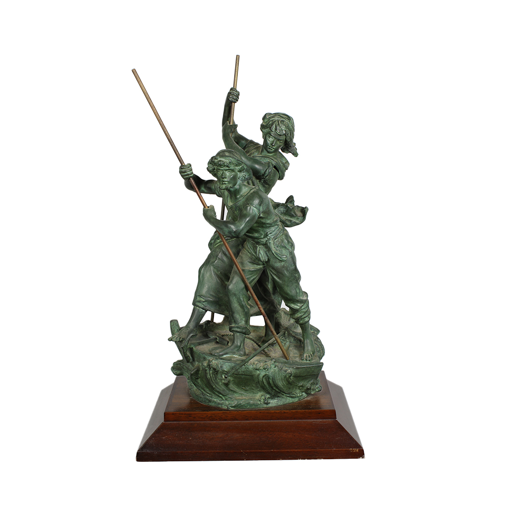 GRUPPO SCULTOREO in metallo bronzato raffigurante naviganti XX secolo h cm 60,5 x 36 x 27