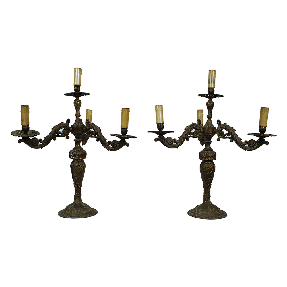 COPPIA DI CANDELABRI in ottone a quattro luci maestranze siciliane XX secolo h cm 51 x 41,5