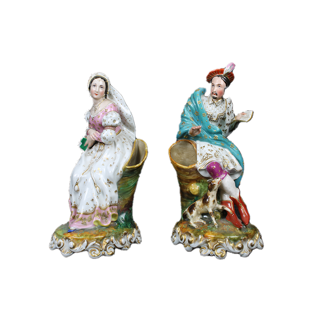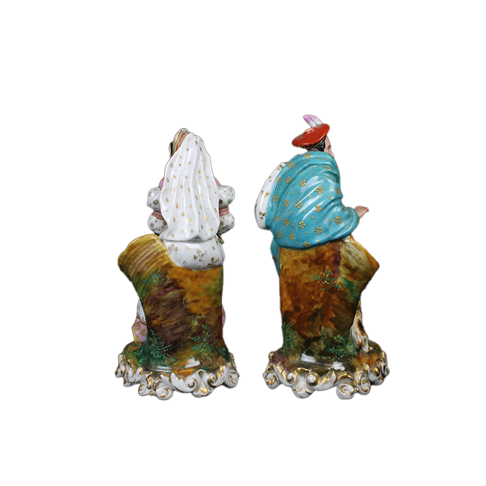 COPPIA DI SCULTURE in porcellana policroma raffiguranti nobil uomo e nobil donna maestranze francesi XX secolo h cm 27 - h cm 25