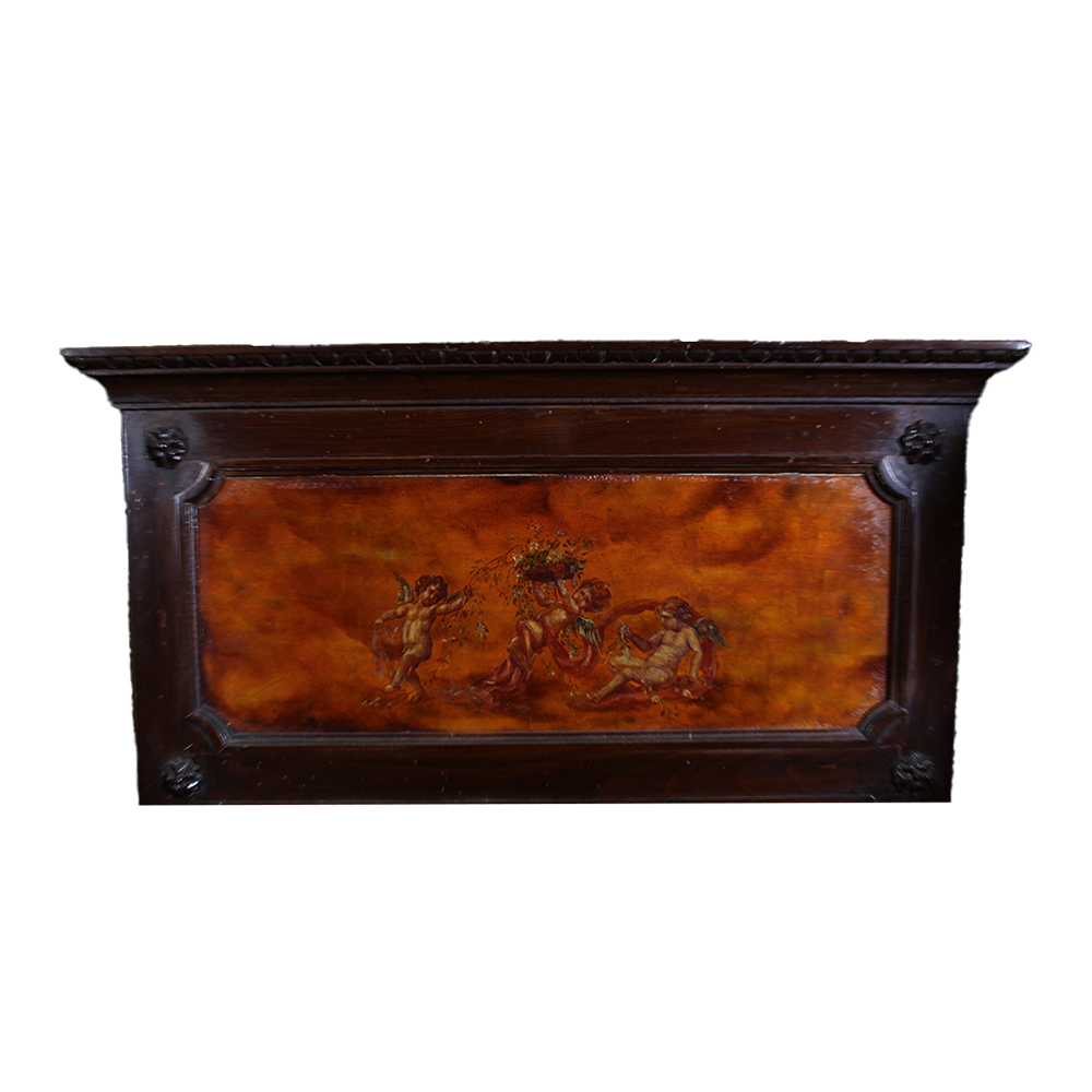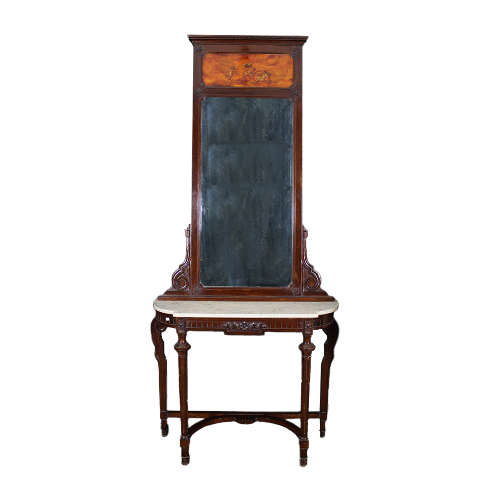 CONSOLLE CON SPECCHIERA in legno di noce con pannello dipinto raffigurante allegoria di putti piano in marmo arabescato Sicilia fine XIX inizi XX secolo h cm 281 x 125 x 42