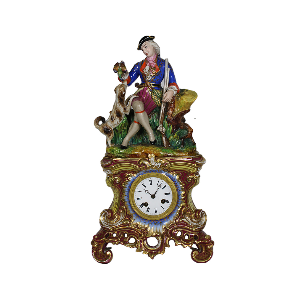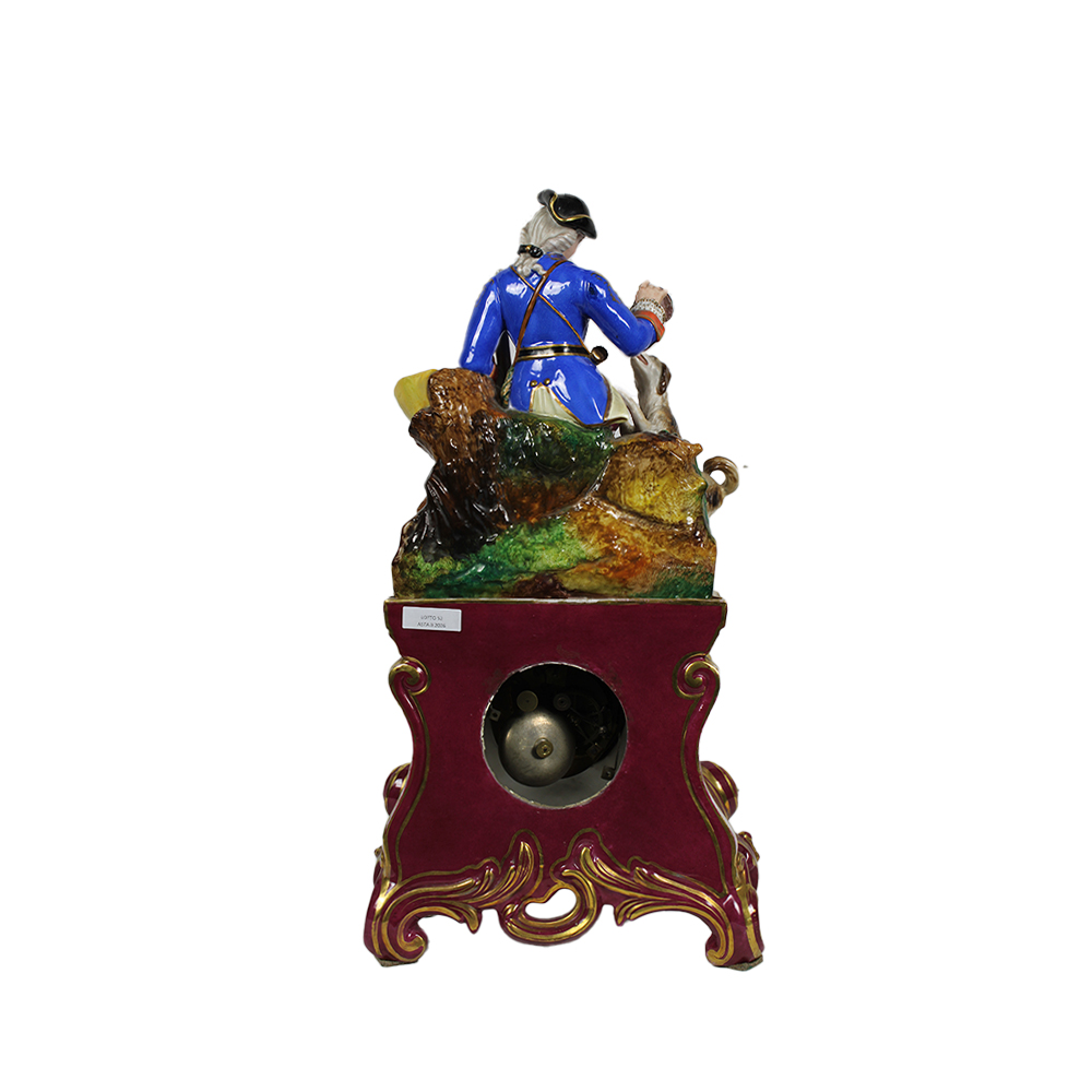 OROLOGIO LUIGI FILIPPO in porcellana dipinta in policromia con lumeggiature in oro raffigurante cacciatore e cane con base in legno dorato dentro campana in vetro Francia XIX secolo h cm 50 x 27 x 13 - campana h cm 59,5 x 37 x 18