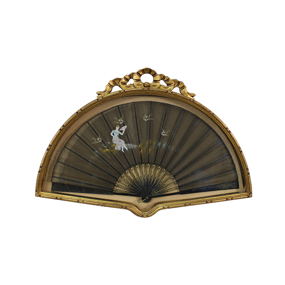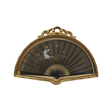 VENTAGLIO con stecche in legno ebanizzato traforato con lumeggiature in oro decorate a motivi floreali pavé in tulle dipinta raffigurante donna e uccelli dentro teca in legno dorata Sicilia primi 900 h cm 33 x 64 - teca h cm 51 x 73