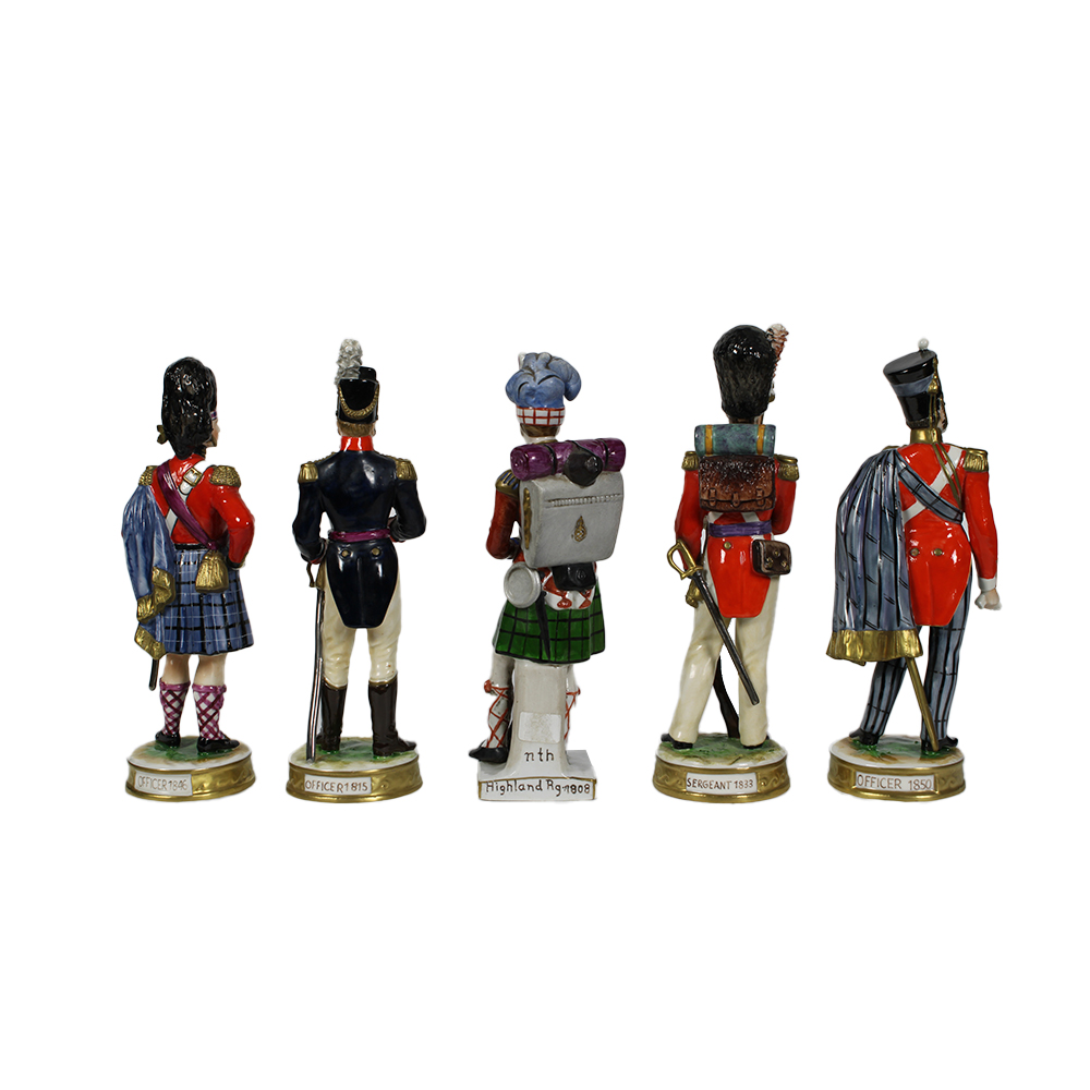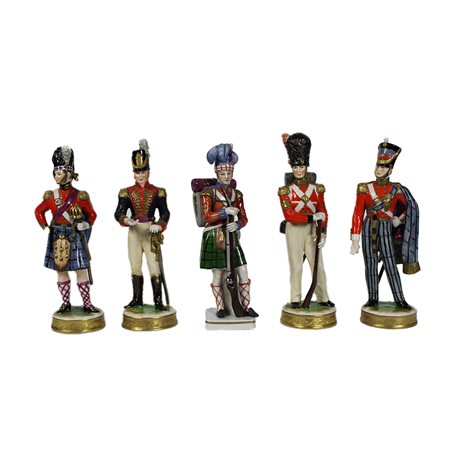 LOTTO COMPOSTO DA CINQUE SCULTURE in porcellana dipinte in policromia con lumeggiature in oro raffiguranti soldati diverse manifatture tra cui Capodimonte XX secolo h cm 22 x 6
