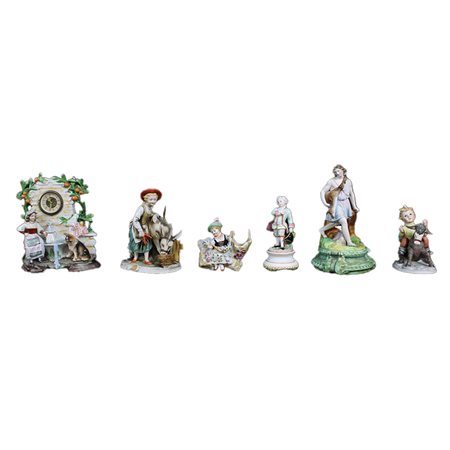 LOTTO COMPOSTO DA un orologio e cinque gruppi in porcellana policroma raffigurante personaggi diverse manifatture XX secolo misure varie