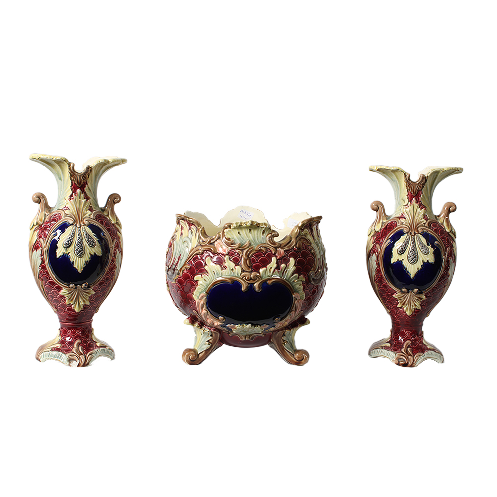 TRITTICO Trittico in porcellana dipinta in policromia composto da due vasi e un alzata manifattura Eiehwald Inghilterra primi 900 h cm 21 x 22 - h cm 28 x 13 x 10