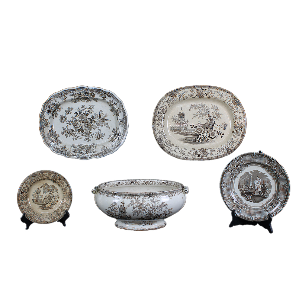 LOTTO COMPOSTO DA da due vassoi e sei piatti e una zuppiera in porcellana dipinta a grisaille di diverse manifatture tra cui Davenport Primavesi e sons Colancine Asiatic Gheusanti Inghilterra XX secolo misure varie