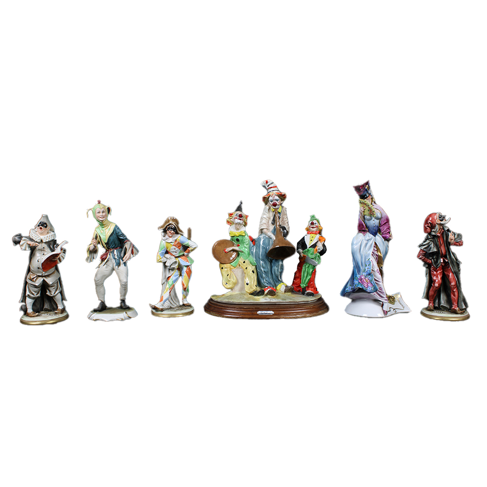 LOTTO DI SEI SCULTURE in porcellana policroma raffiguranti figure carnevalesche e clown diverse manifatture XX secolo misure varie