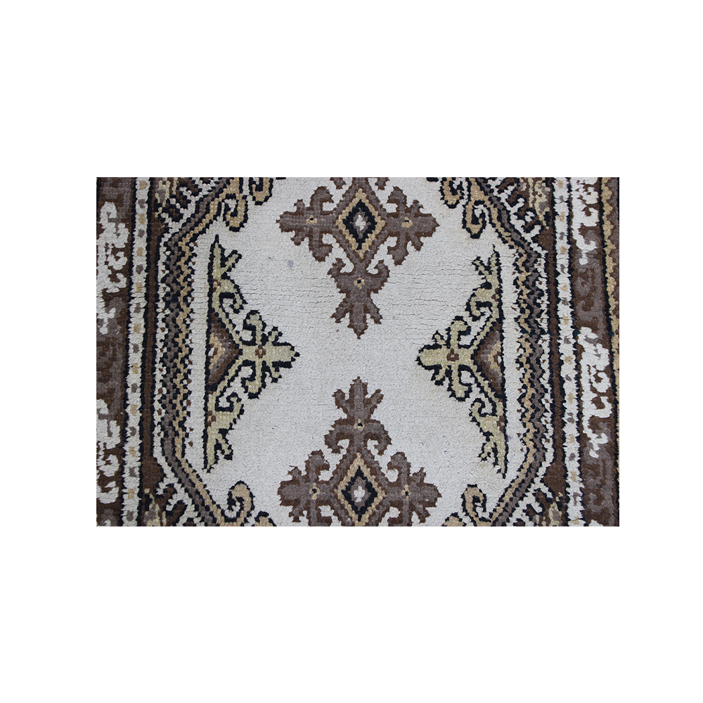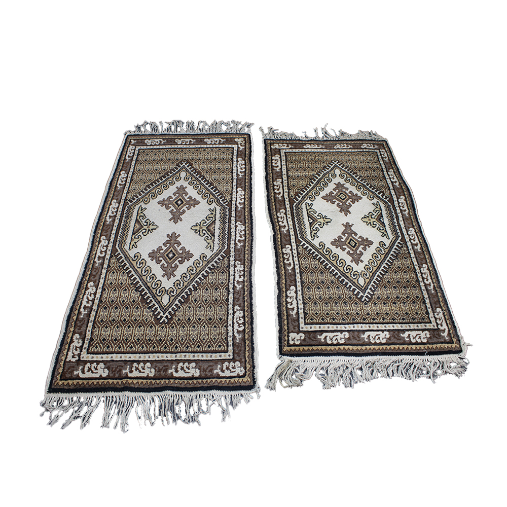 COPPIA DI PICCOLI TAPPETI ORIENTALI SCENDILETTO annodati a mano, caratterizzati da un campo centrale avorio decorato con medaglioni geometrici cruciformi e motivi stilizzati in tonalità terra, bruno e ocra. La composizione è racchiusa entro un ampio medaglione a losanga su fondo nocciola con micro-pattern geometrico e bordure a contrasto con motivi a greca stilizzata. Vello in lana con frange bianche alle estremità. Manifattura di area caucasica, XX secolo. Buone condizioni generali con lievi e normali segni d'uso. cm 168 x 78 - cm 145 x 74