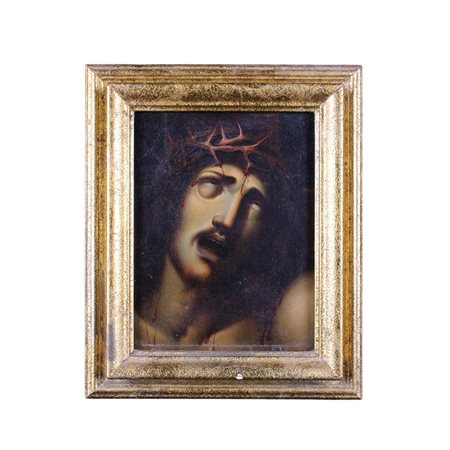 OLIO SU TELA raffigurante Cristo dentro cornice non coeva manifattura italiana II meta XIX secolo h cm 26 x 20 / cornice h cm 35 x 29