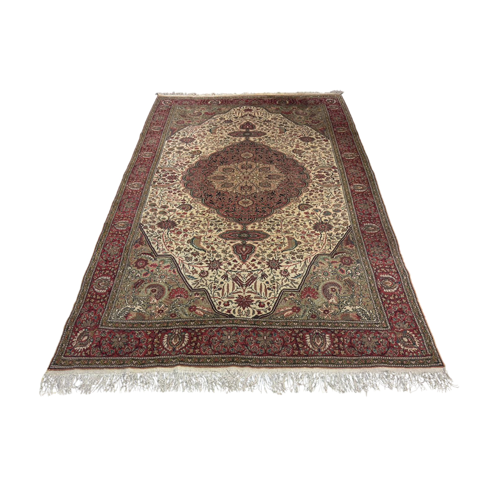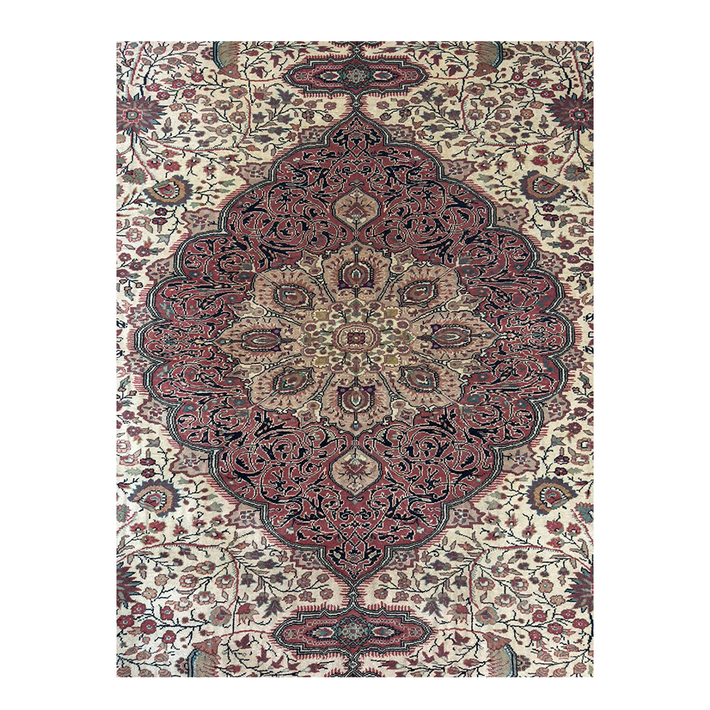 TAPPETO ORIENTALE annodato a mano con medaglione centrale e ricca decorazione floreale su campo chiaro. Vello in lana con frange alle estremità. Manifattura di area persiana XX secolo. Condizioni generali buone con lievi segni d'uso. cm 315 x 200