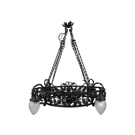 LAMPADARIO A 5 LUCI in ferro battuto decorato da motivi floreali e ghiande, bocce in vetro satinato Sicilia fine 800 primi 900 h cm 95 x 88 x 77