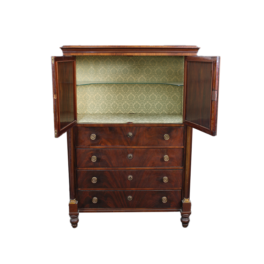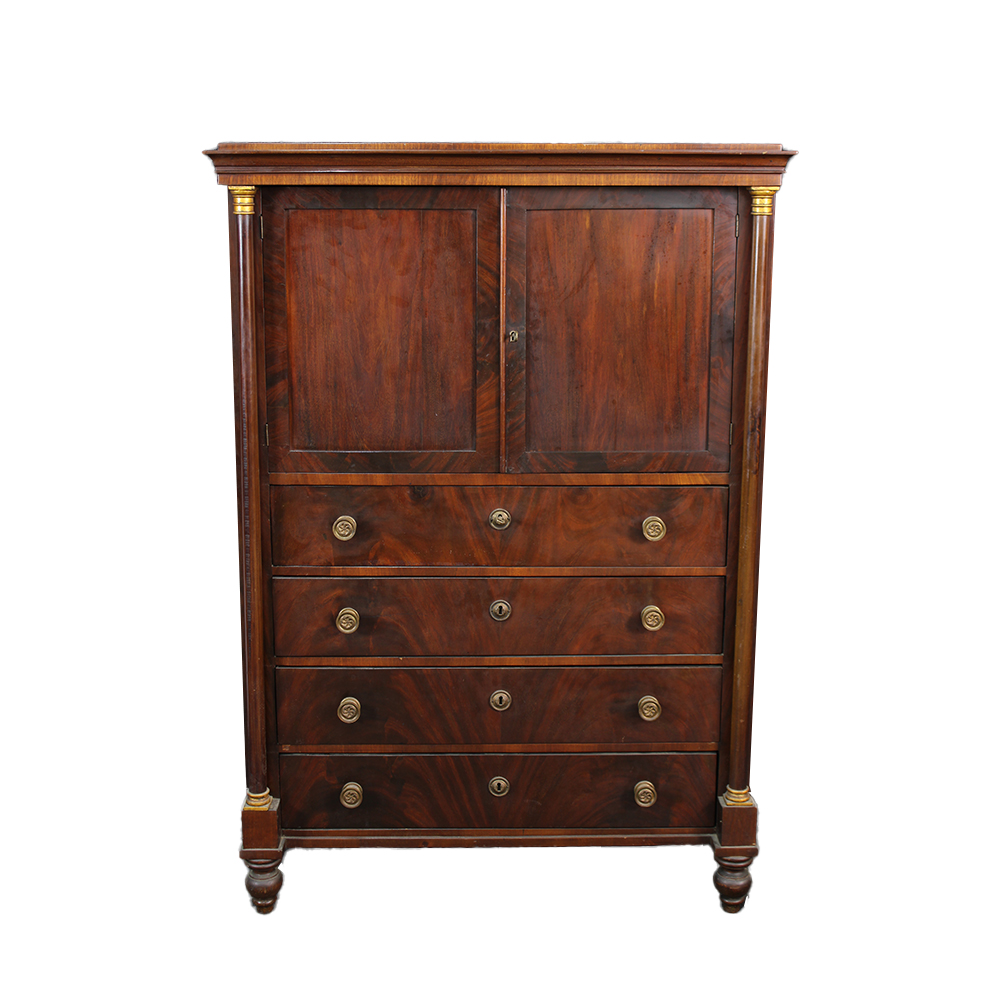 CHIFFONIER IMPERO in legno di mogano a 4 cassetti e due ante arricchite da colonne con basi e capitelli in legno dorato Sicilia XIX secolo h cm 160x 111 x 54