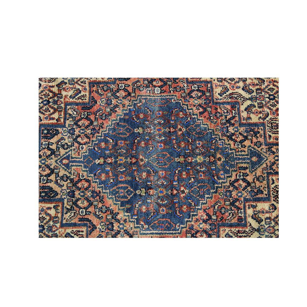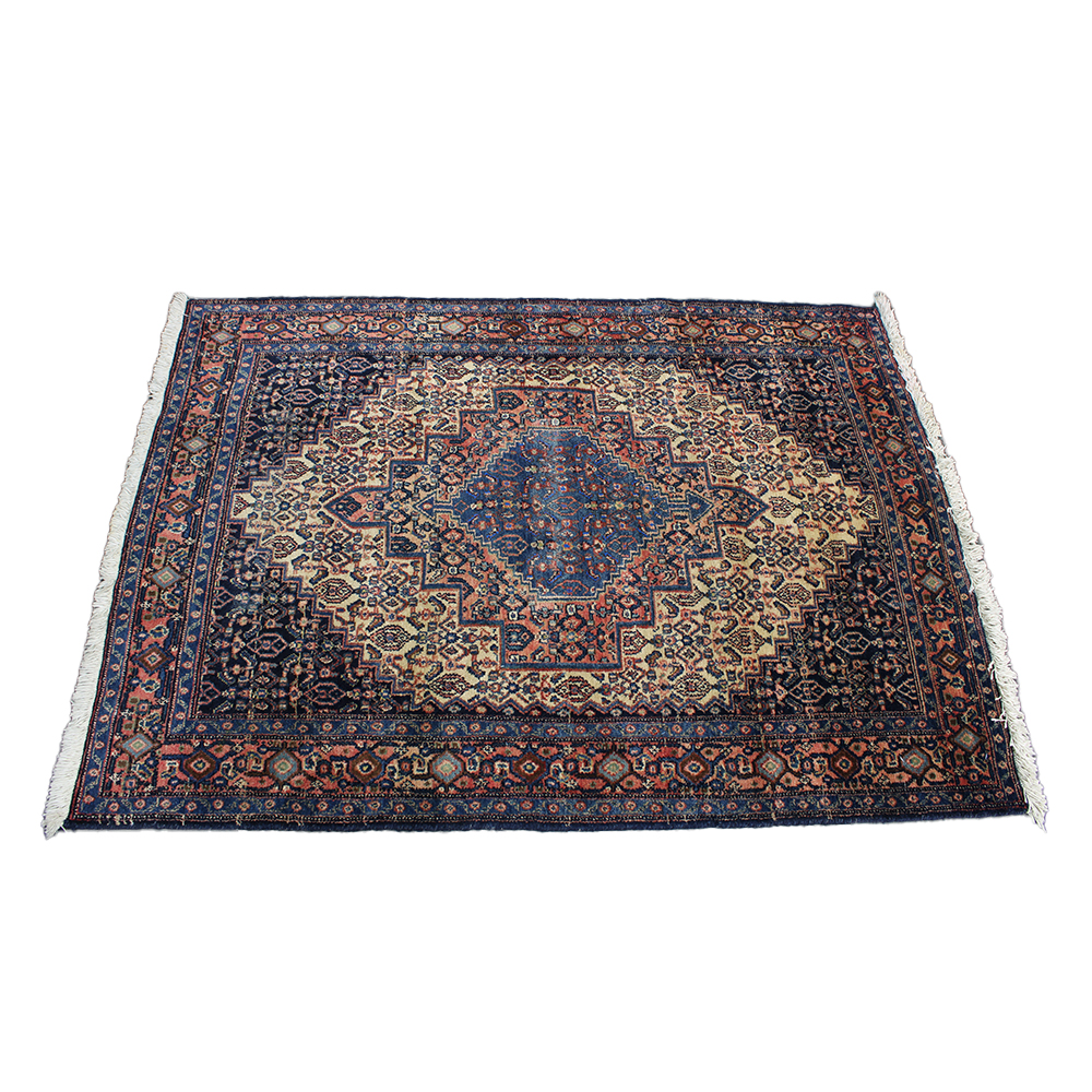 TAPPETO PERSIANO Manifattura persiana, Annodato a mano con imponente medaglione centrale a gradoni su fondo blu notte e campo crema. Decori floreali stilizzati e angolari ruggine; bordura a foglia seghettata su fondo blu. Vello in lana robusta con frange bianche. XX secolo. Buone condizioni con patina d'epoca. cm 170 x 120