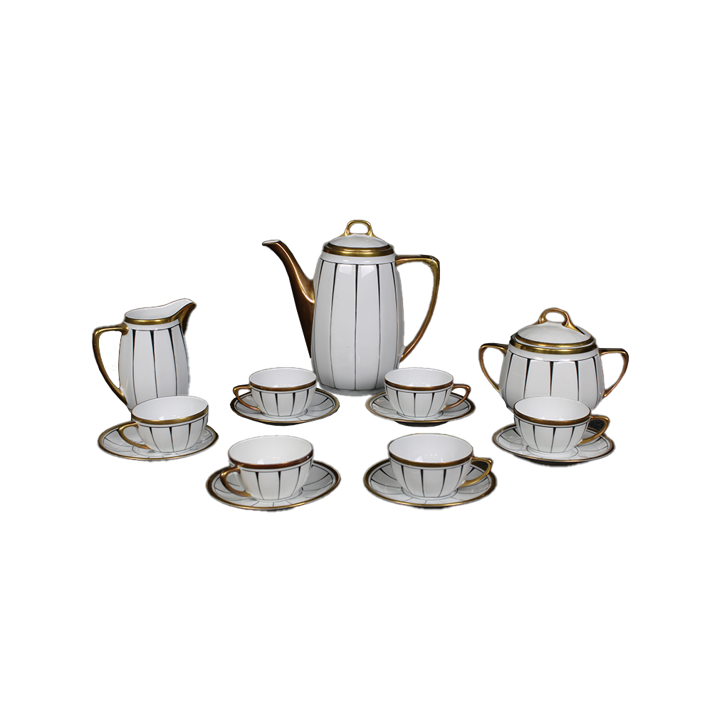 SERVIZIO DA CAFFÈ in porcellana bianca con lumeggiature in oro composto da caffettiera lattiera zuccheriera e sei tazze con piattino , incollaggio manico della caffettiera manifattura KTM Germania XX secolo misure varie