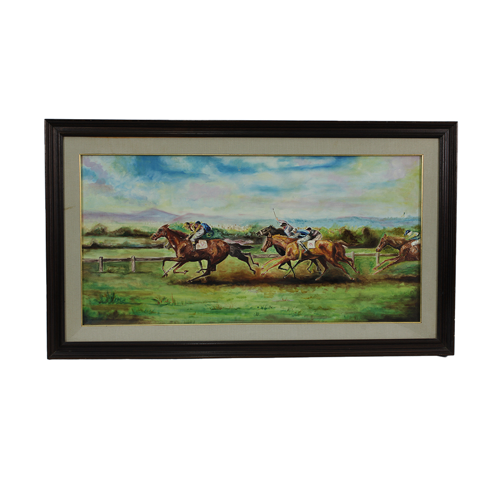 OLIO SU TELA Olio su tela raffigurante corsa di cavalli dentro cornice in legno anonimo italiano XX secolo h cm 50 x 100 - cornice h cm 68,5 x 118