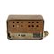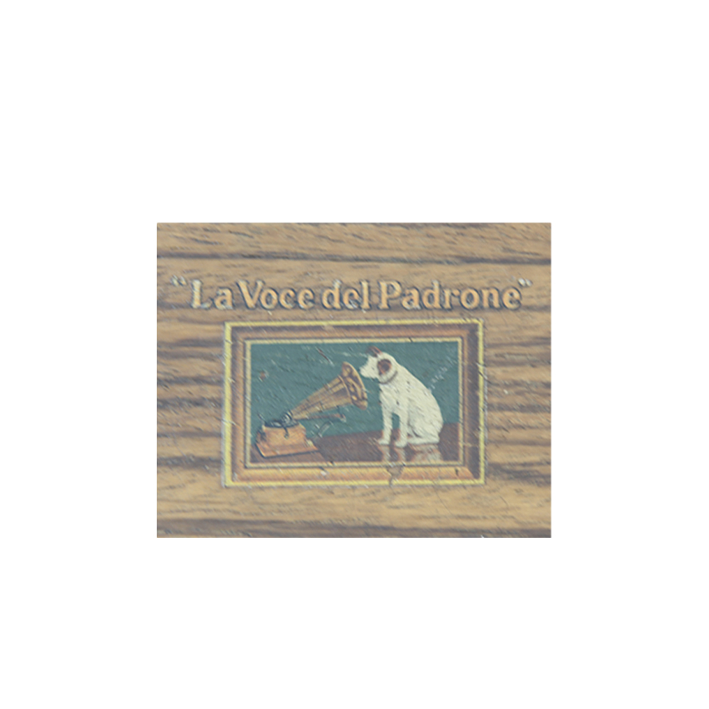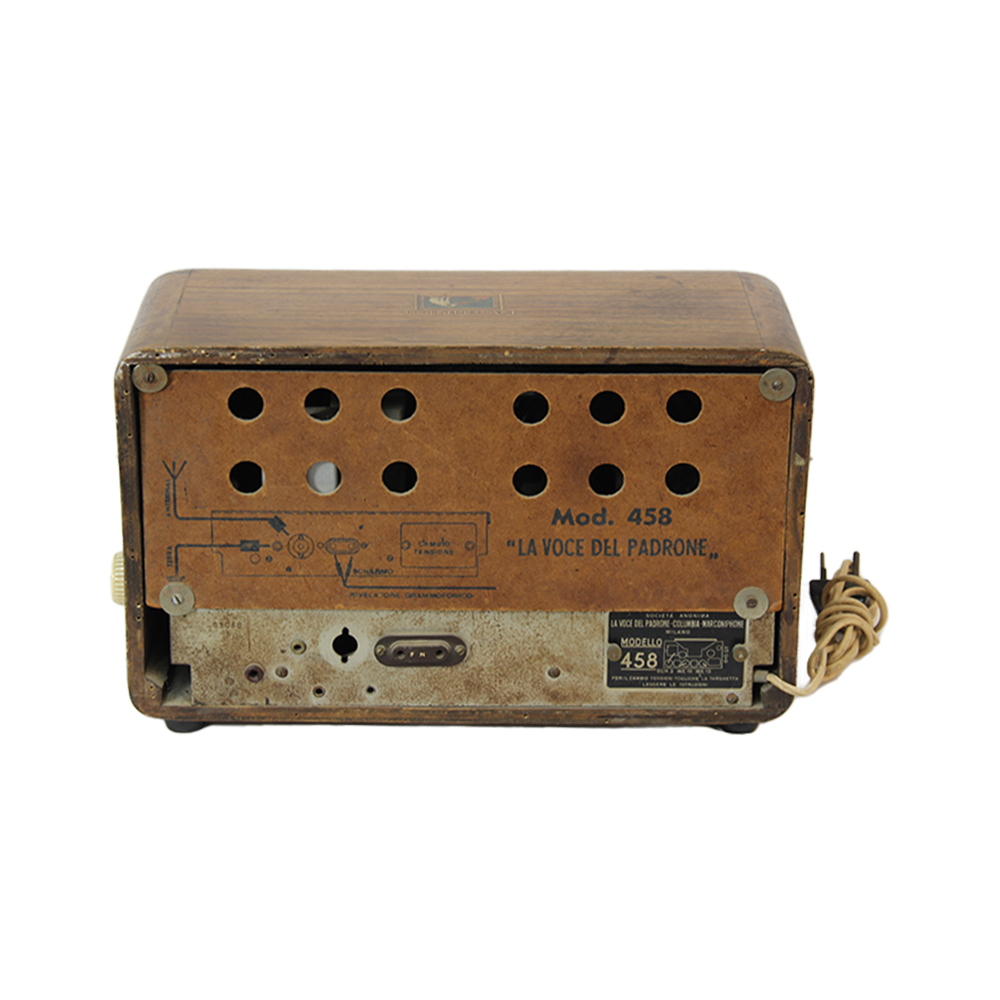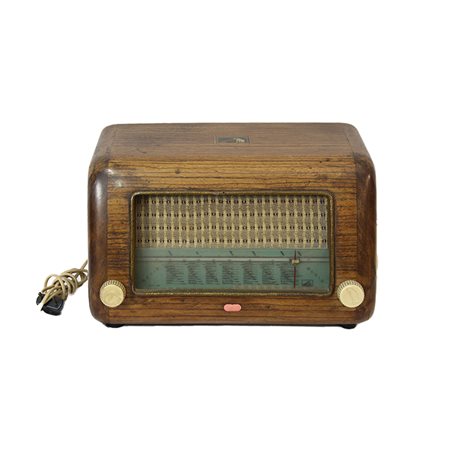 RADIO D'EPOCA A VALVOLE produzione la voce del padrone "His Master's Voice", cassa in legno impiallicciato con design curvo e frontale con ampia scala parlante in vetro indicante le frequenze, manopole in bachelite e logo iconico con il cane e il grammofono sul lato superiore. usure del tempo, da revisionare. Inghilterra anni 50 h cm 22 x 36 x 23